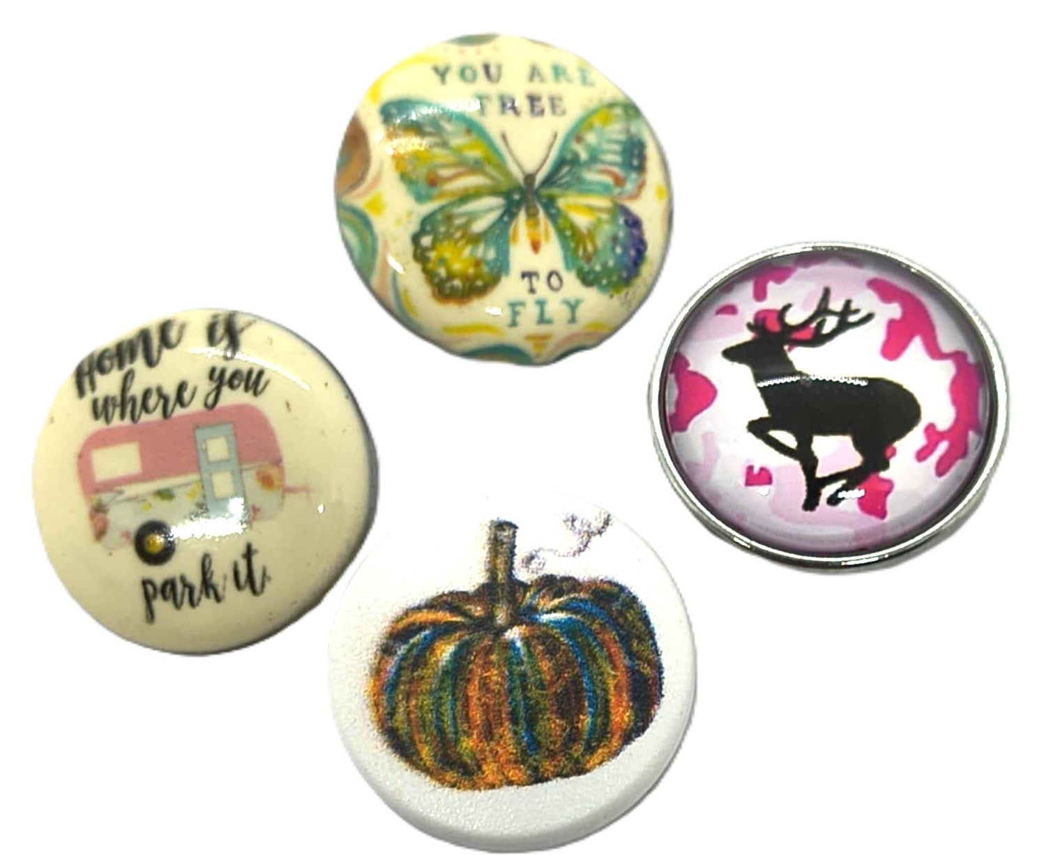 Butterfly, deer, pumpkin, camper.