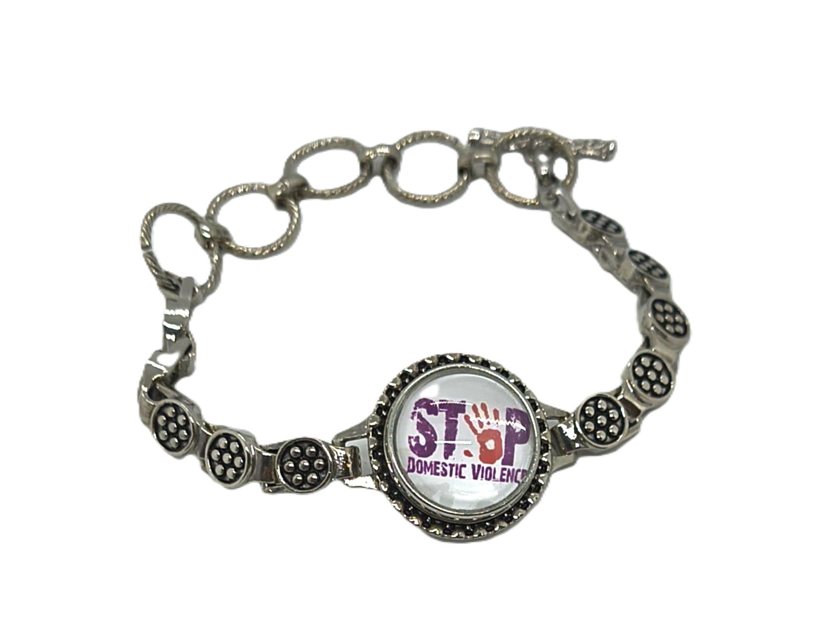 "Stop Domestic Violence" on a link style bracelet with toggle closure.