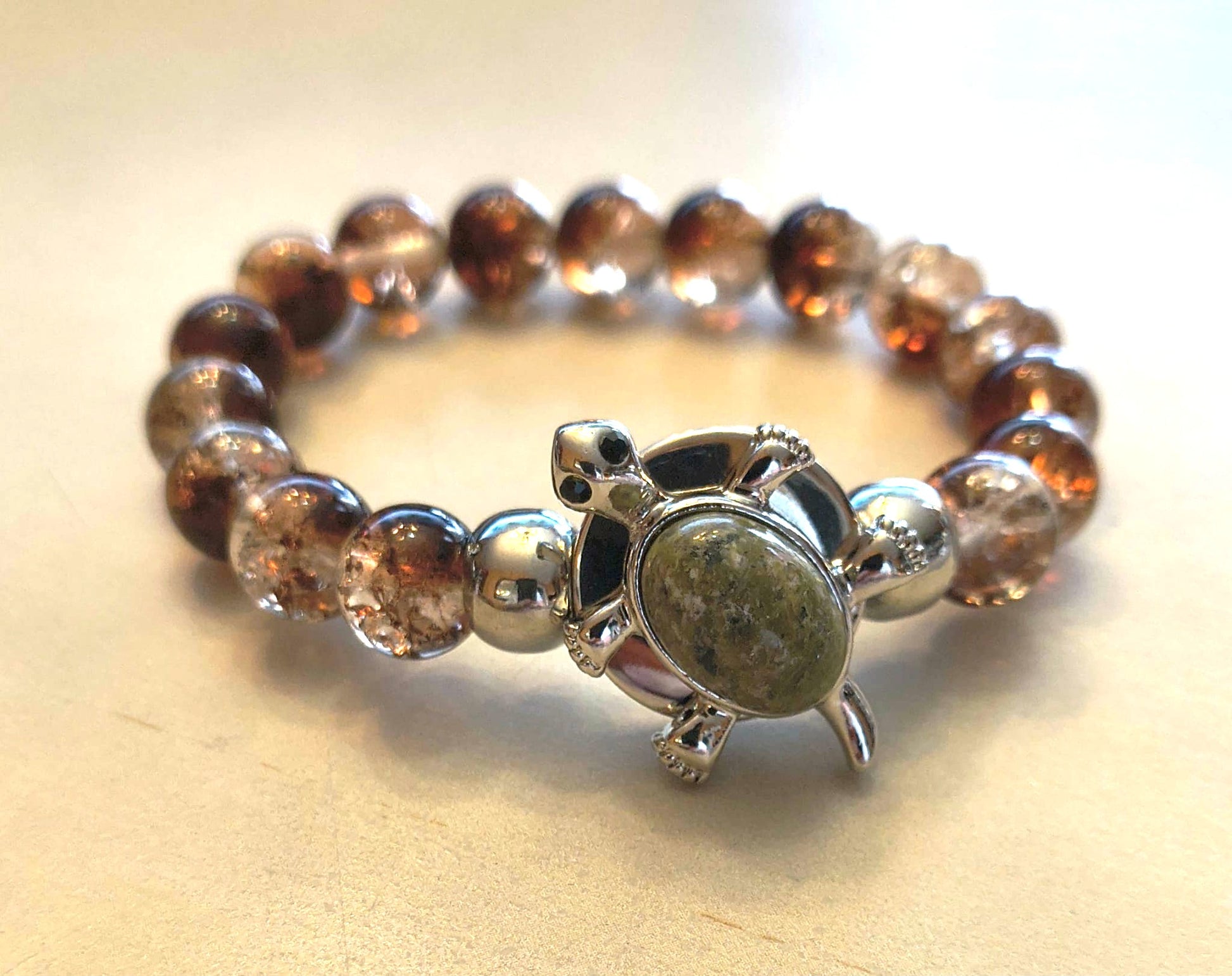 AMBER DELIGHT stretchy bracelet with our Green Turtles snap.