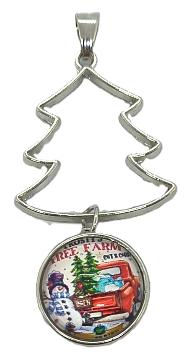 Christmas tree pendant with "Frosty's Tree Farm" snap.